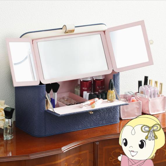 商品コード:PK-0864-50YEコスメボックス バニティケース 三面鏡 アラベスク柄 ワイド コスメケース バニティボックス メイクBOX おしゃれ かわいい ネイビー【送料無料(北海道・沖縄・離島除く)】