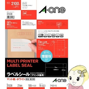 商品コード:CR-09064エーワン 31538 ラベルシール (プリンタ兼用) マット紙 100枚入【送料別】