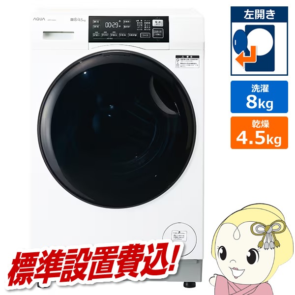 商品コード:AQW-D8AR-Kドラム式洗濯乾燥機 【標準設置費込】 AQUA アクア まっ直ぐドラム 洗濯8kg/乾燥4.5kg 左開き ホワイト AQW-D8A-L-W【送料無料(北海道・沖縄・離島対応不可)】