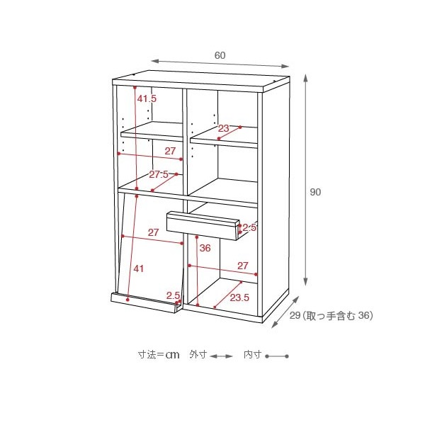 | サイズ | [外寸]幅60×奥行29(取っ手含む36)×高さ90cm[内寸](オープン部)幅27×奥行27.5×高さ41.5cm(扉内)幅27×奥行23.5×高さ41.5(有効36)cm(飾り棚)幅27×奥行2.5×高さ41cm(可動棚)幅27×奥行23×厚み1.8cm(3.2cmピッチ5穴) |