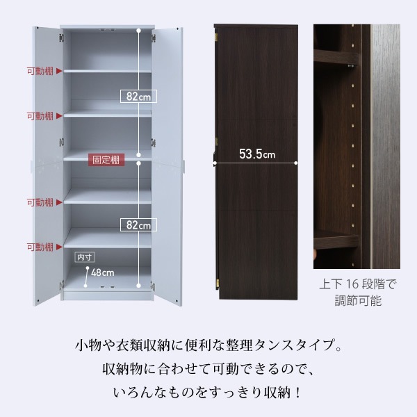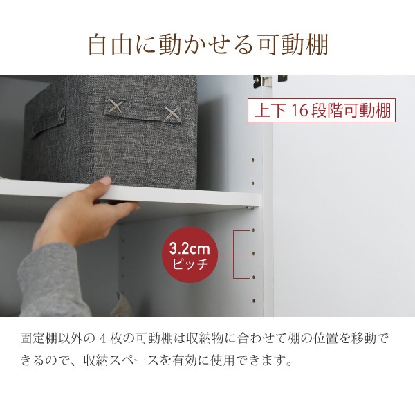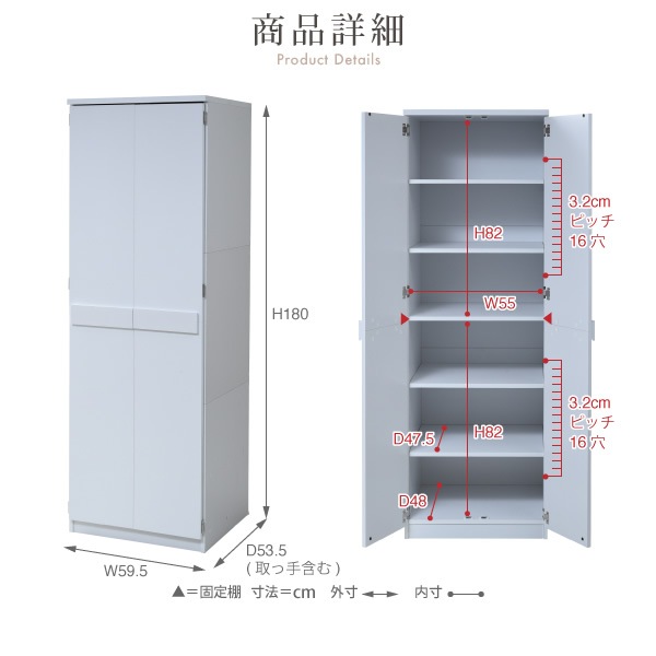 | サイズ | [外寸] 幅59.5×奥行53.5×高さ180cm [内寸] (扉内上段)幅55×奥行48×高さ82cm (扉内下段)幅55×奥行48×高さ82cm (可動棚)幅55.5×奥行47.5×厚み1.7cm(3.2cmピッチ16穴) |