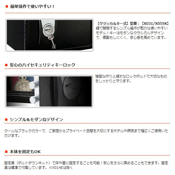 | 付属品 | 鍵2本、ボルトダウンキット、取扱説明書 (保証の際には、取扱説明書とレシートなどの購入証明書が必要になります。) |