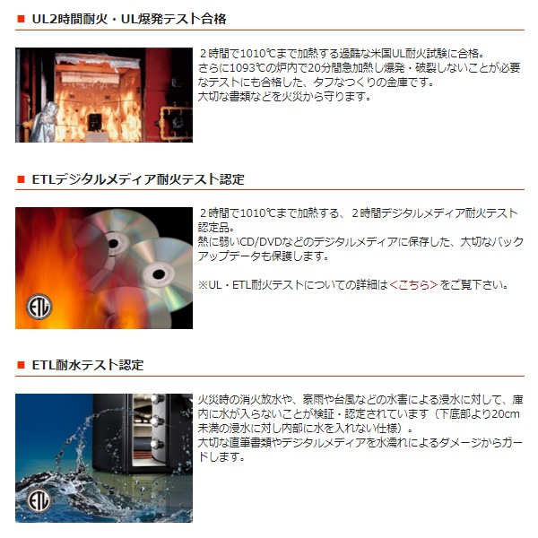 | 性能 | UL2時間耐火テスト合格 ETL耐水性能テスト認定 UL爆発テスト合格 ETL落下衝撃テスト認定 ETLデジタルメディア耐火テスト認定 A4サイズ収納可能 |