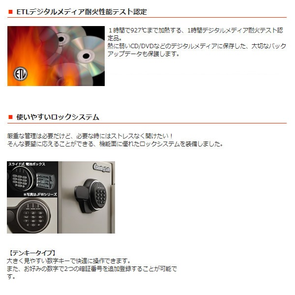 | 性能 | UL1時間耐火テスト合格 UL爆発テスト合格 ETL落下衝撃テスト認定 ETLデジタルメディア耐火テスト認定 A4サイズ収納可能 |