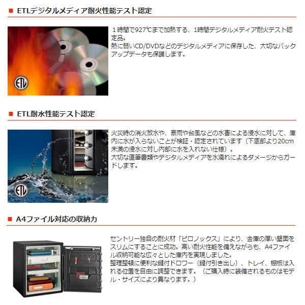 | 性能 | UL1時間耐火テスト合格 ETL耐水性能テスト認定 UL爆発テスト合格 ETL落下衝撃テスト認定 ETLデジタルメディア耐火テスト認定 A4サイズ収納可能 |