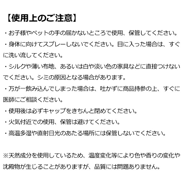 | 成分 | エタノール、精製水、ユーカリ・ラディアータ精油、ティートゥリー精油、マジョラム精油、タイム・チモール精油、ベルガモット精油、ラベンダー精油、ペパーミント精油、PEG-40水添ヒマシ油 |