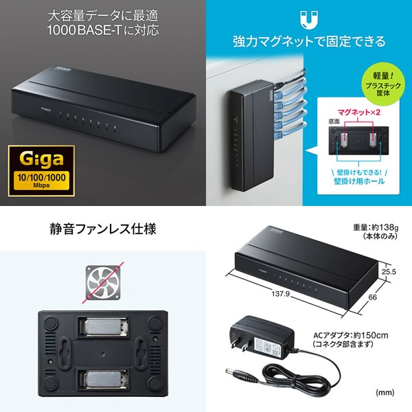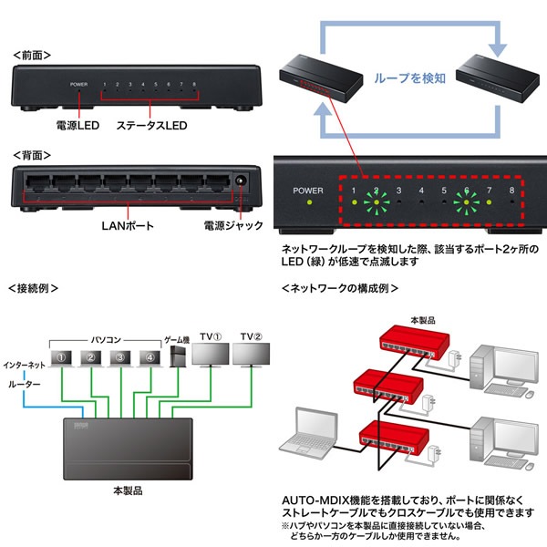 | ポート構成 | 1000BASE-T/100BASE-TX/10BASE-T(RJ-45) AUTO-MDIX ×8ポート |