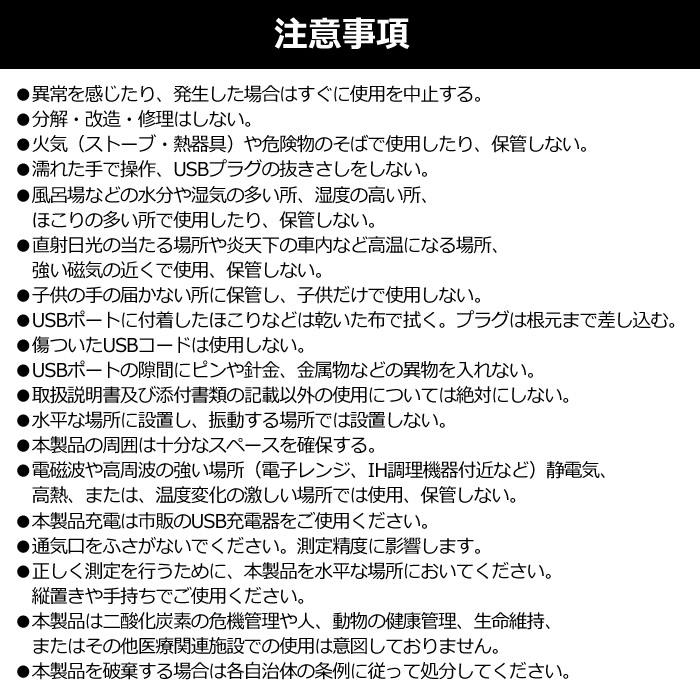 | 測定範囲 | 二酸化炭素濃度: 400~995ppm(緑色表示) 1000~1995ppm(黄色表示) 2000~5000ppm(赤色表示) |