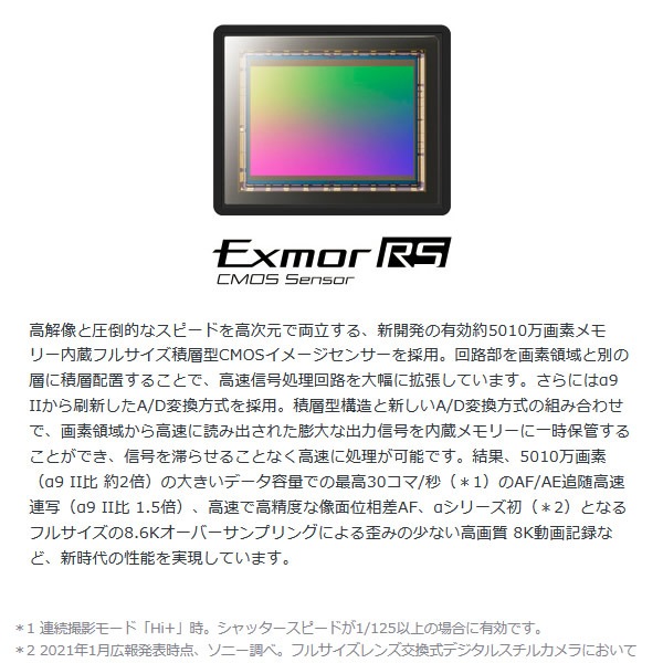 | 撮像素子 | 35mmフルサイズ (35.9 x 24.0mm)、Exmor RS CMOSセンサー |