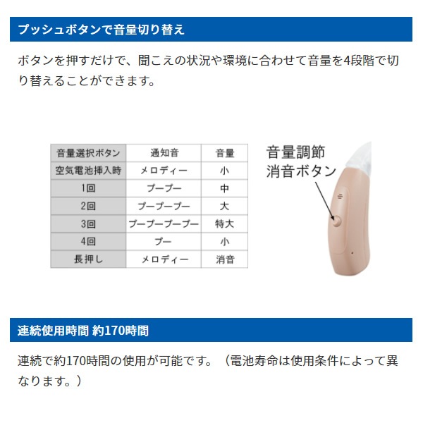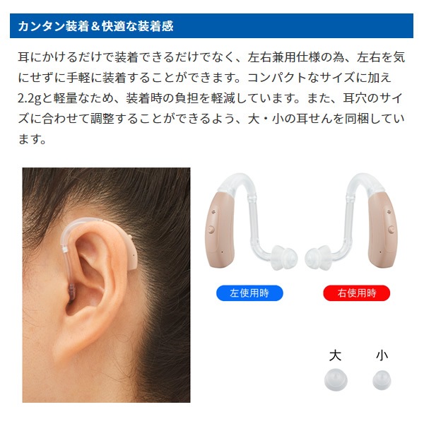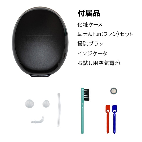 | 付属品 | 耳せんFun(ファン)セット1、化粧ケース1、掃除ブラシ1 お試し用空気電池1、インジケータ1、取扱説明書1、保証書1 |