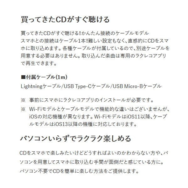| 付属品 | ACアダプター、バックアップ用DVD-R、取扱説明書(保証書) ケーブル3種 (USB Micro-B to Lightning/USB Micro-B to Type-C/USB Micro-B to Micro-B) |