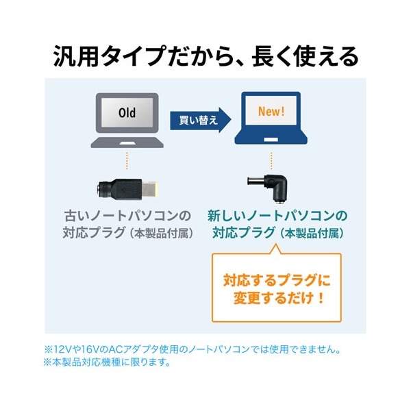 | 変換プラグサイズ | 【D1】外形6.5mm、内径4.3mm、センターピンあり 【D3】外形5.5mm、内径2.5mm 【D6黒】外形3.0mm、内径1.1mm 【D6青】外形4.5mm、内径2.9mm、センターピンあり 【D8】外形3.5mm、内径1.35mm 【FORDELL】外形4.5mm、内径2.9mm、センターピンあり 【角形】角形プラグ(11mm×4.65mm)、センターピンあり |
