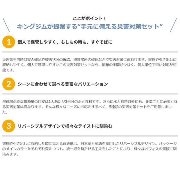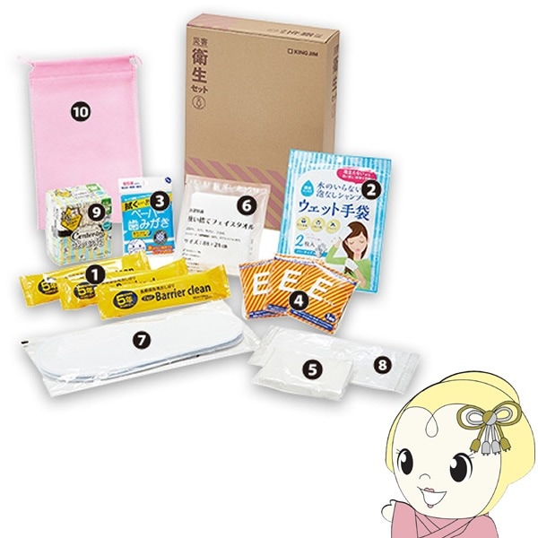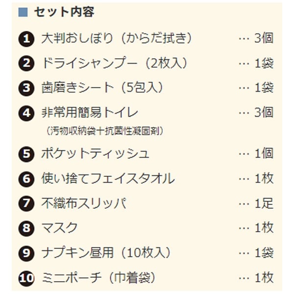 | セット内容 | 1大判おしぼり(からだ拭き)… 3個 2ドライシャンプー(2枚入)… 1袋 3歯磨きシート(5包入)… 1袋 4非常用簡易トイレ(汚物収納袋十抗菌性凝固剤)… 3個 5ポケットティッシュ… 1個 6使い捨てフェイスタオル… 1枚 7不織布スリッパ… 1足 8マスク… 1枚 9ナプキン昼用(10枚入)… 1袋 10ミニポーチ(巾着袋)… 1枚 |