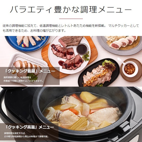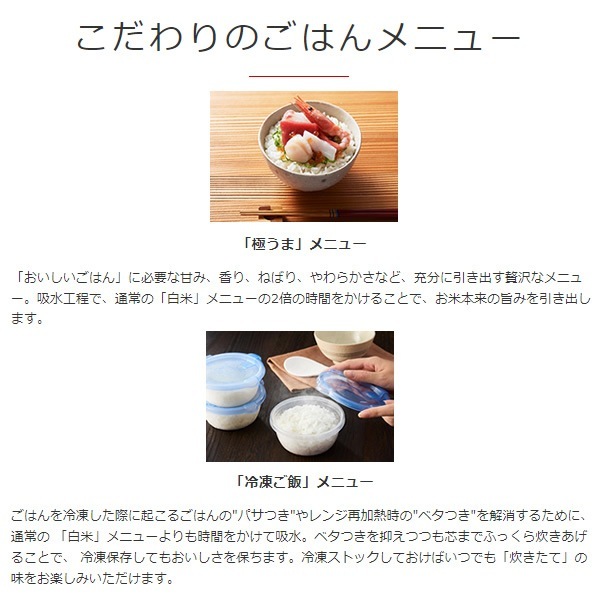 | メニュー | エコ炊き、白米、極うま、早炊き、冷凍ご飯、無洗米、炊込み玄米、おこわ、クッキング高温、クッキング低温、パン発酵、パン焼き |
