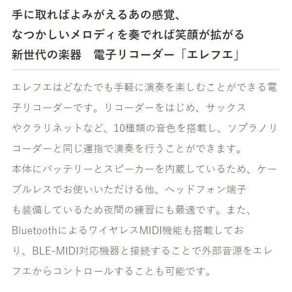 | 付属品 | シリコン製ウォッシャブルマウスピース、マイクロUSB-Bケーブル、布製バッグ、日本語取扱説明書、運指表 |