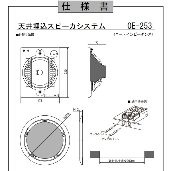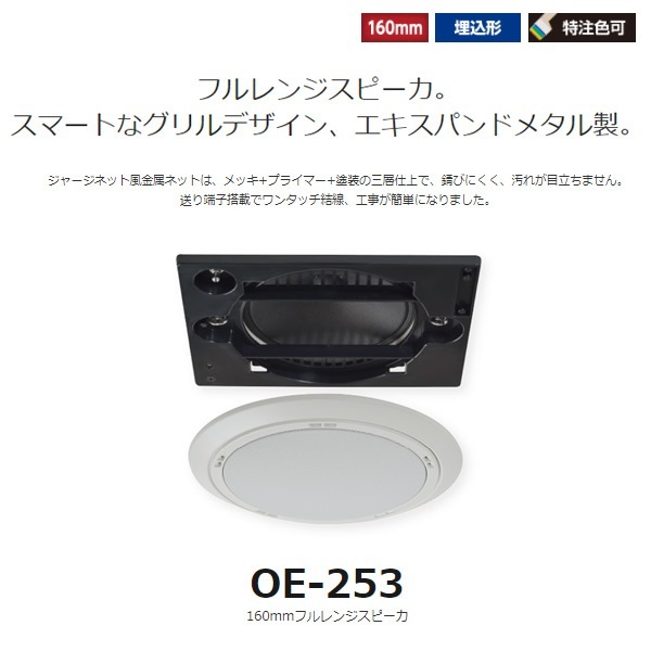 | 出力音圧 | OE-253:91dB(1W/1m) / OE-253AT:85dB(1W/1m) /OE-H253:91dB(1W/1m) / OE-H253AT:91dB(1W/1m) |