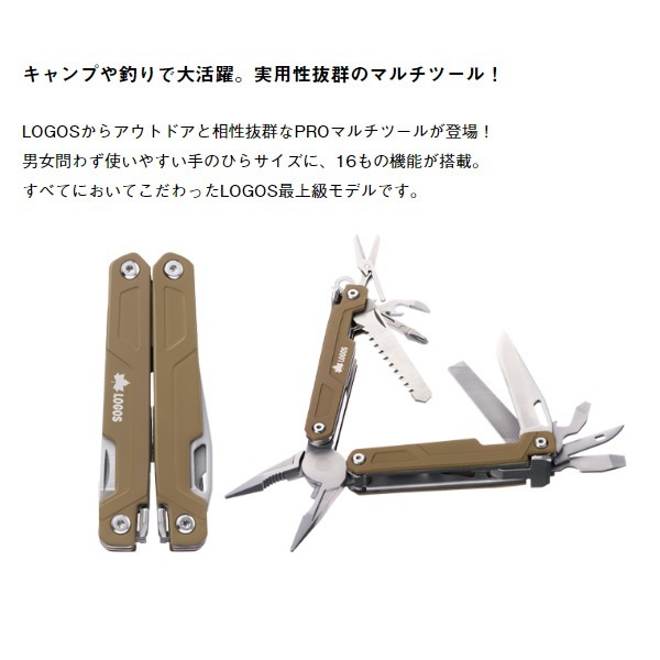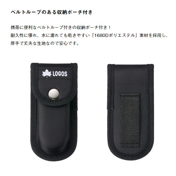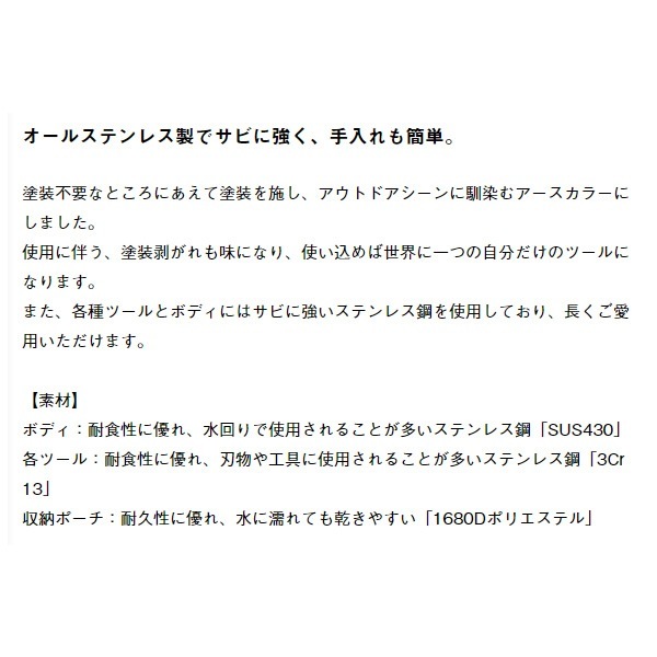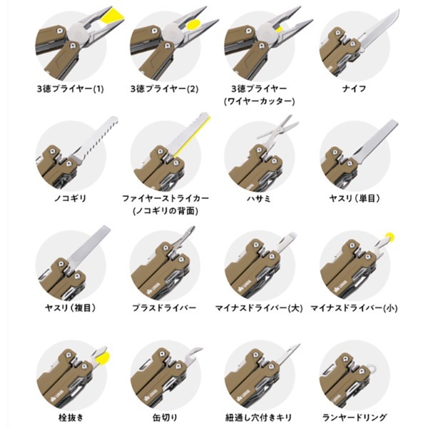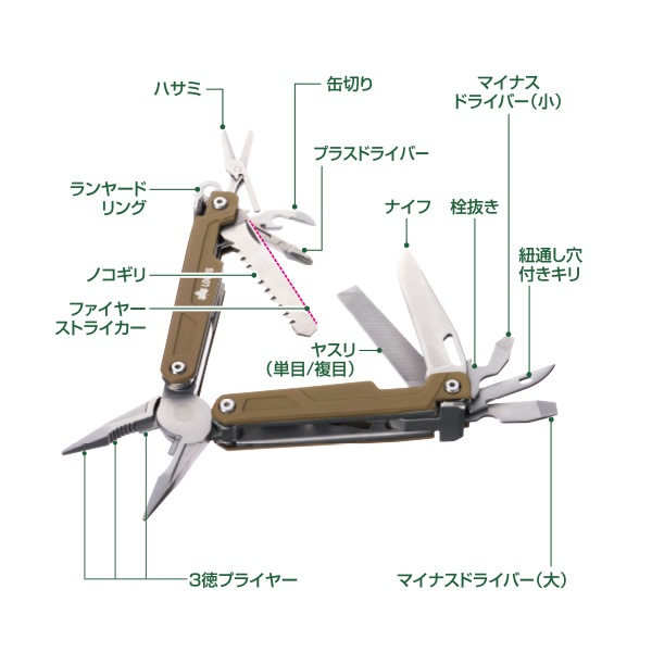 | 機能 | 3徳プライヤー 、ナイフ、ノコギリ、ハサミ、ヤスリ(単目/複目)、プラスドライバー、マイナスドライバー(大/小)、栓抜き、缶切り、紐通し穴付きキリ、ファイヤーストライカー、ランヤードリング |