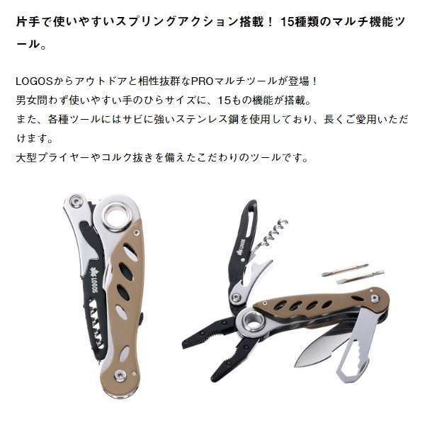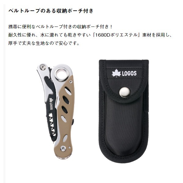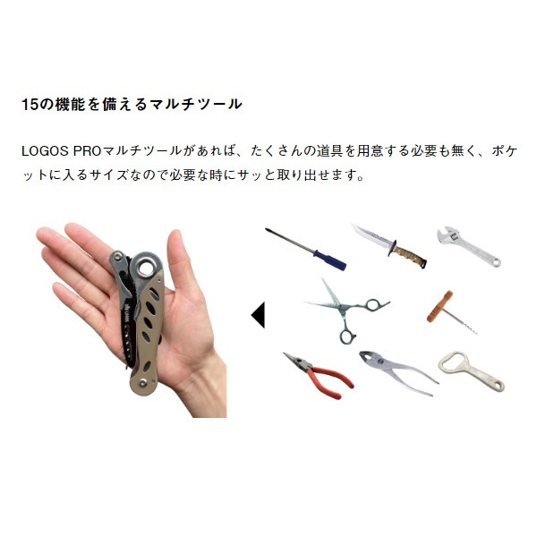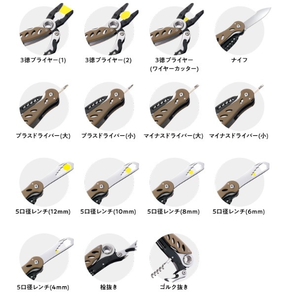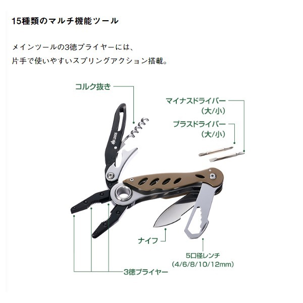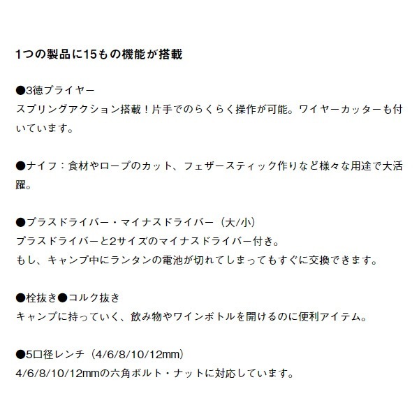 | 機能 | 3徳プライヤー 、ナイフ、栓抜き、コルク抜き、プラスドライバー(大/小)、マイナスドライバー(大/小)、5口径レンチ(4/6/8/10/12mm) |