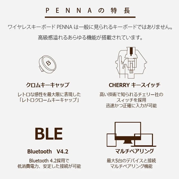 | 本体パッケージ内容 | PENNA Keyboard本体 スペースキーx1 取り扱い説明書・保証書 |