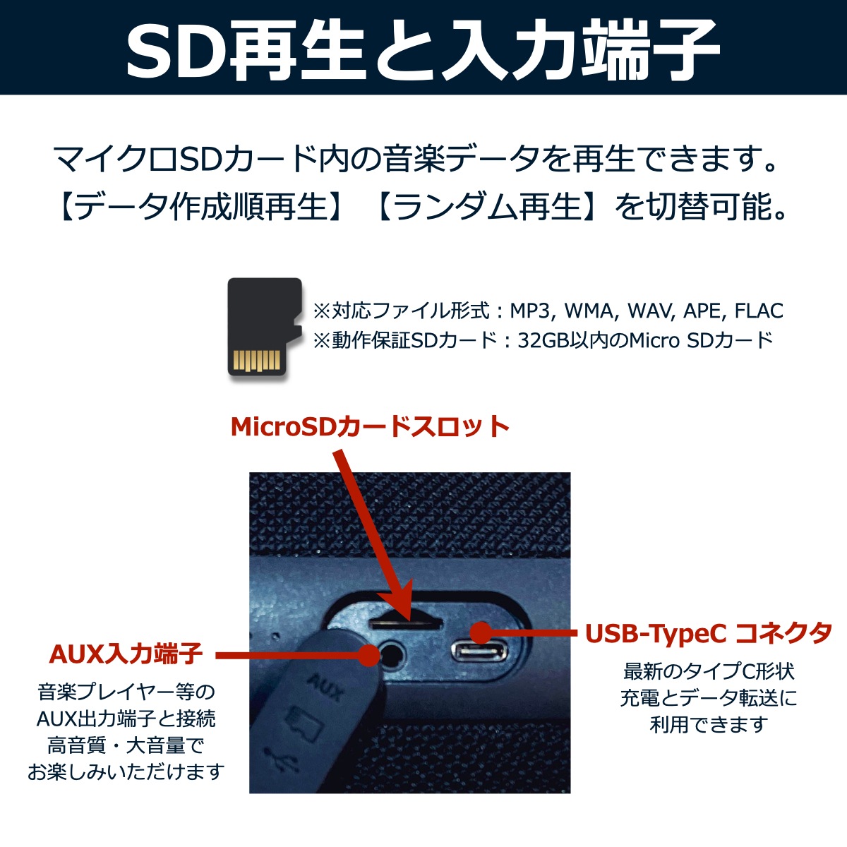 | 対応ファイル形式:MP3, WMA, WAV, APE, FLAC 推奨SDカード仕様:32GB以内のMicroSDカード | |